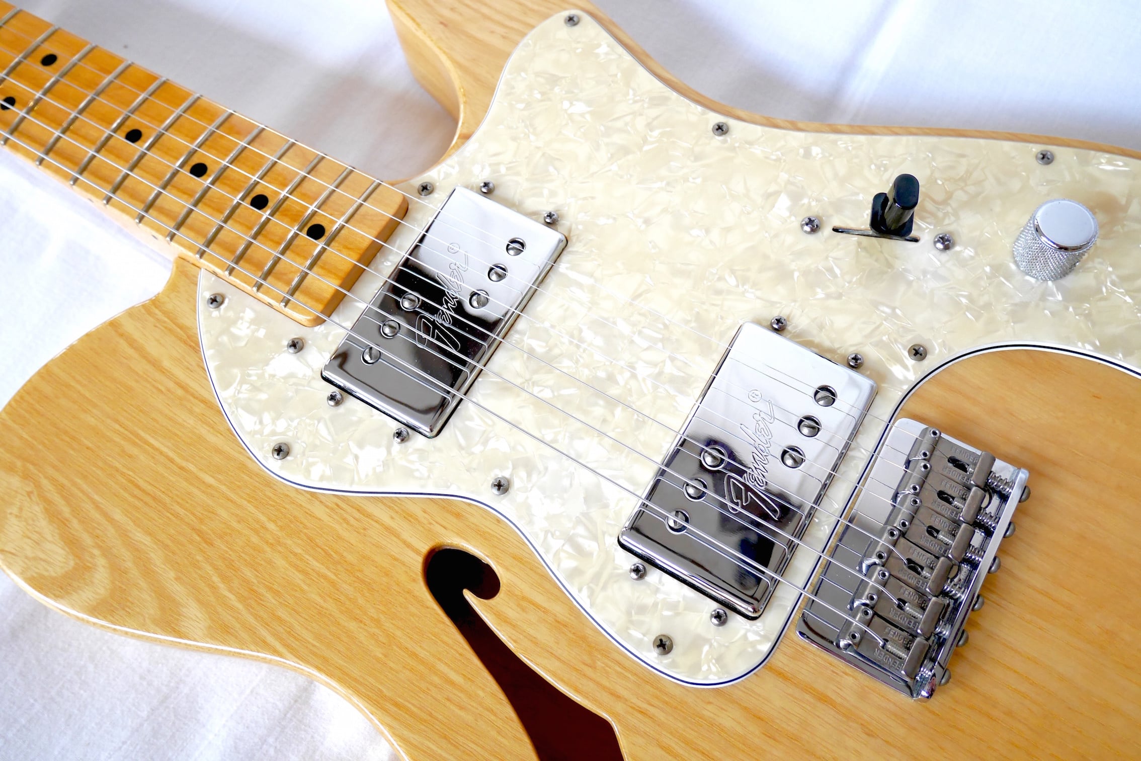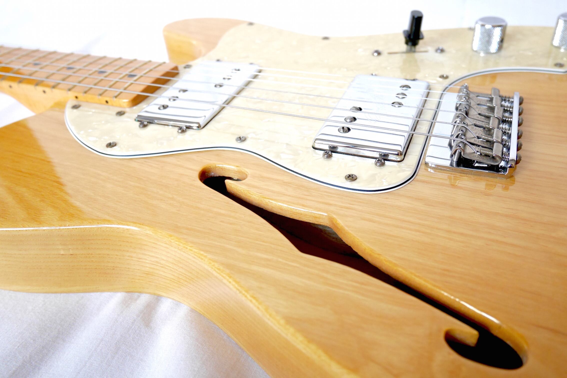 スタンダードなテレキャスター同様アッシュ材をボディに採用していますが、ボディに空けられたFホールにより、エアー感のある豊かなトーンを奏でます。