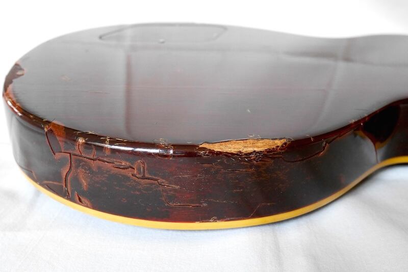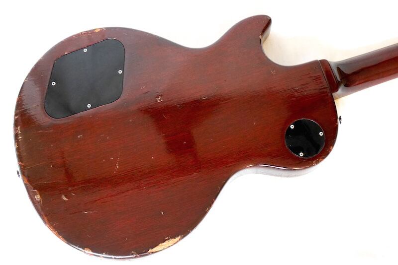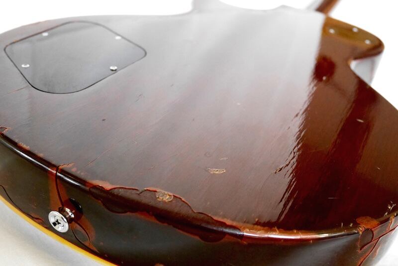 外観:全体的に傷や打痕あり。特にボディサイド・バック面の塗装クラックが大きく出ている。演奏上の致命的なダメージはなし。トグルスイッチリングを交換。その他の交換箇所は不明。